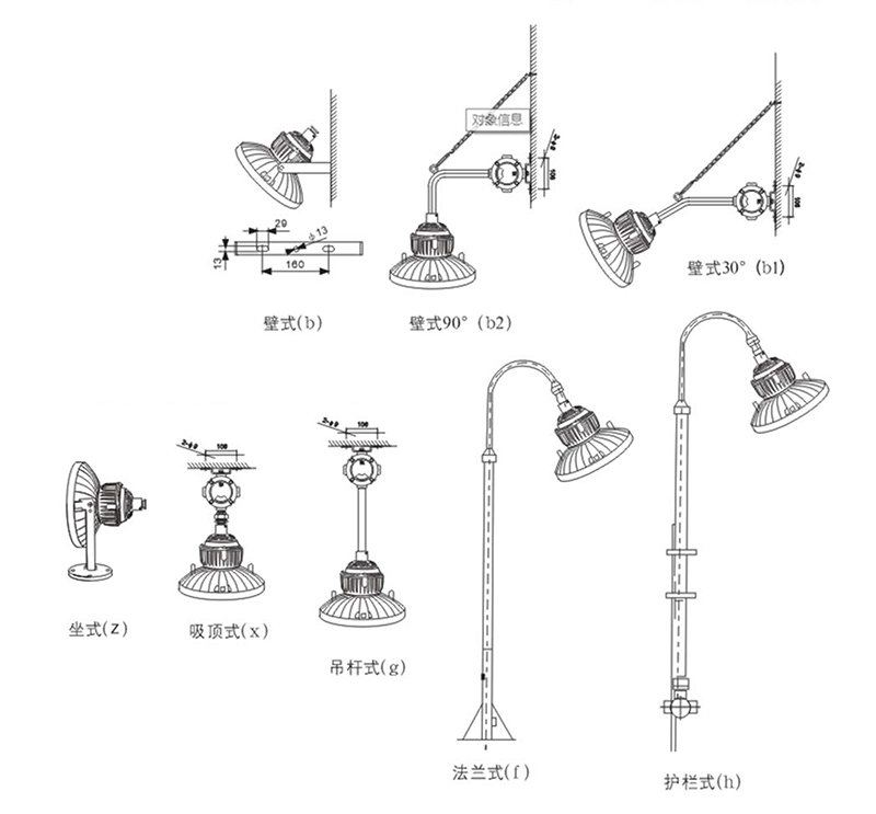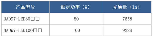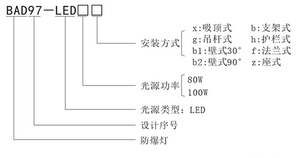 > 按照產(chǎn)品型號規(guī)格說明逐條選擇并注明防爆標(biāo)志,例如:需要防爆 LED 投光燈 100W 規(guī)格,坐式安裝,則產(chǎn)品型號為 BAD97-LED100z ExdⅡCT4