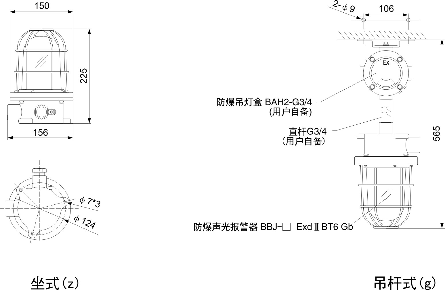 > 吊桿式出廠時,只配直桿 G3/4″(200mm),若需防爆接線盒,防爆活接頭等配件,請另外注明。