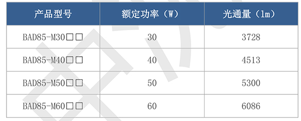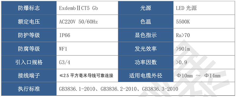 > 按照產品型號規格說明逐條選擇并注明防爆標志,例如:需要防爆 LED 燈 50W 規格,吸頂式安裝,則產品型號為 BAD87-50x ExdembⅡCT5 Gb。
